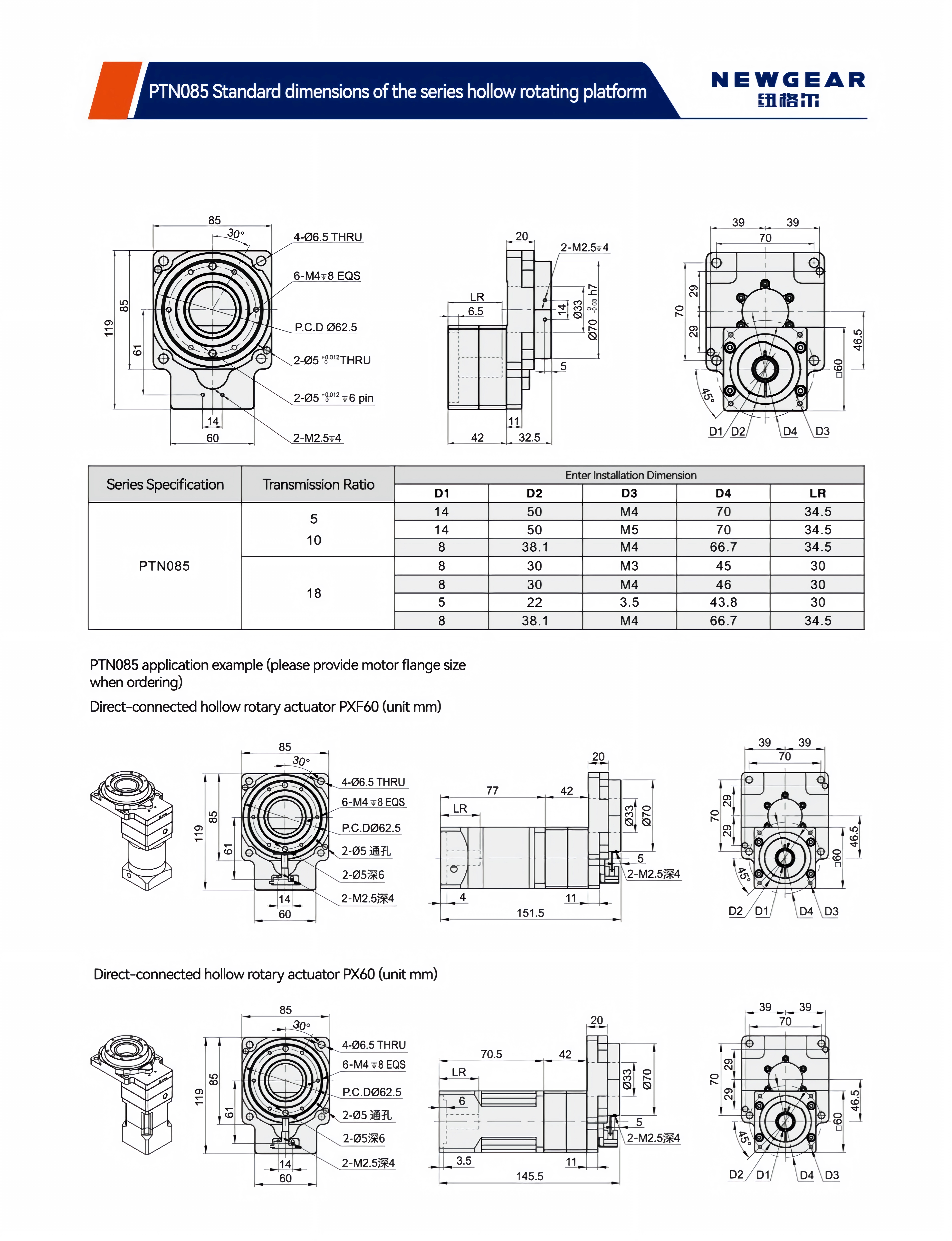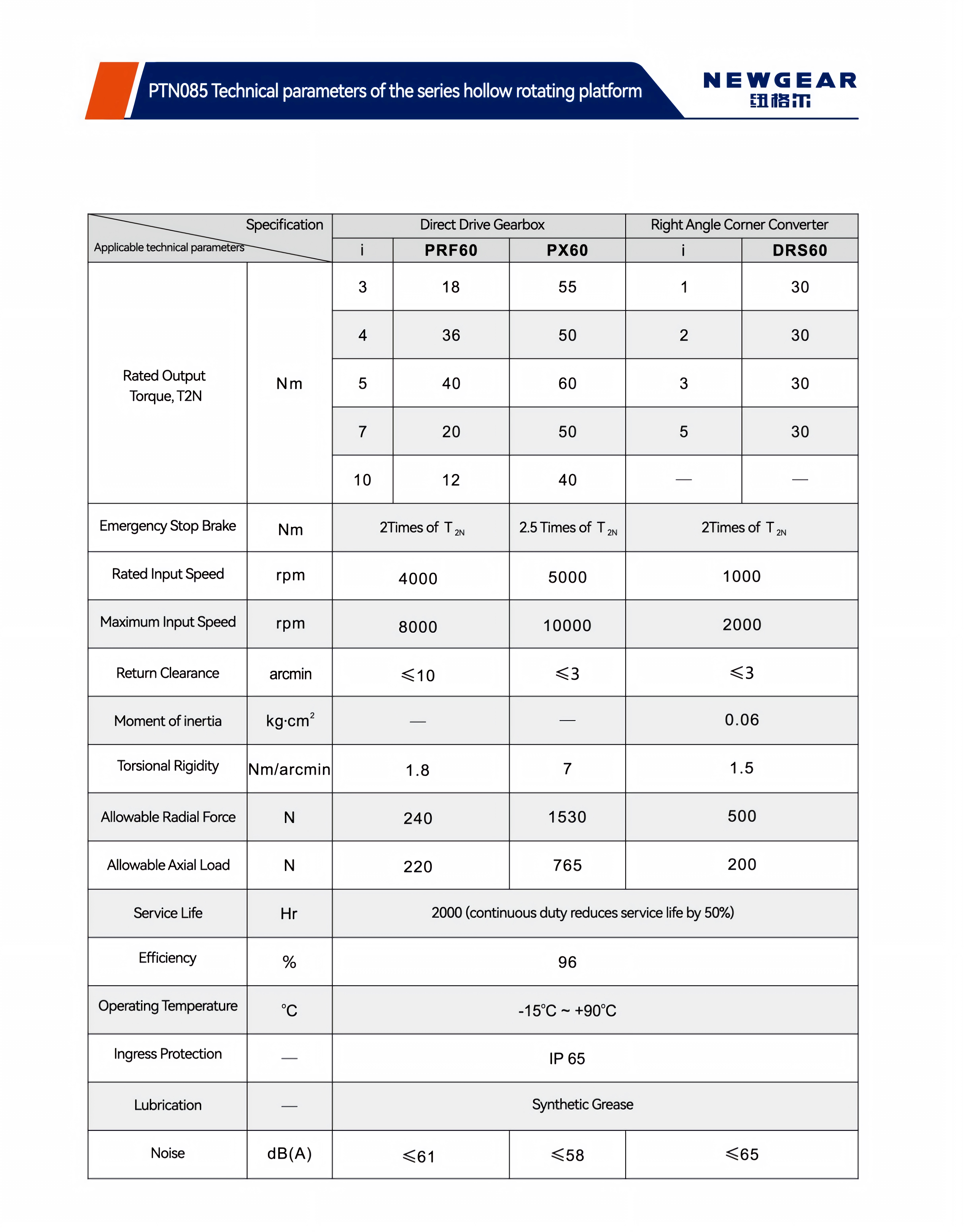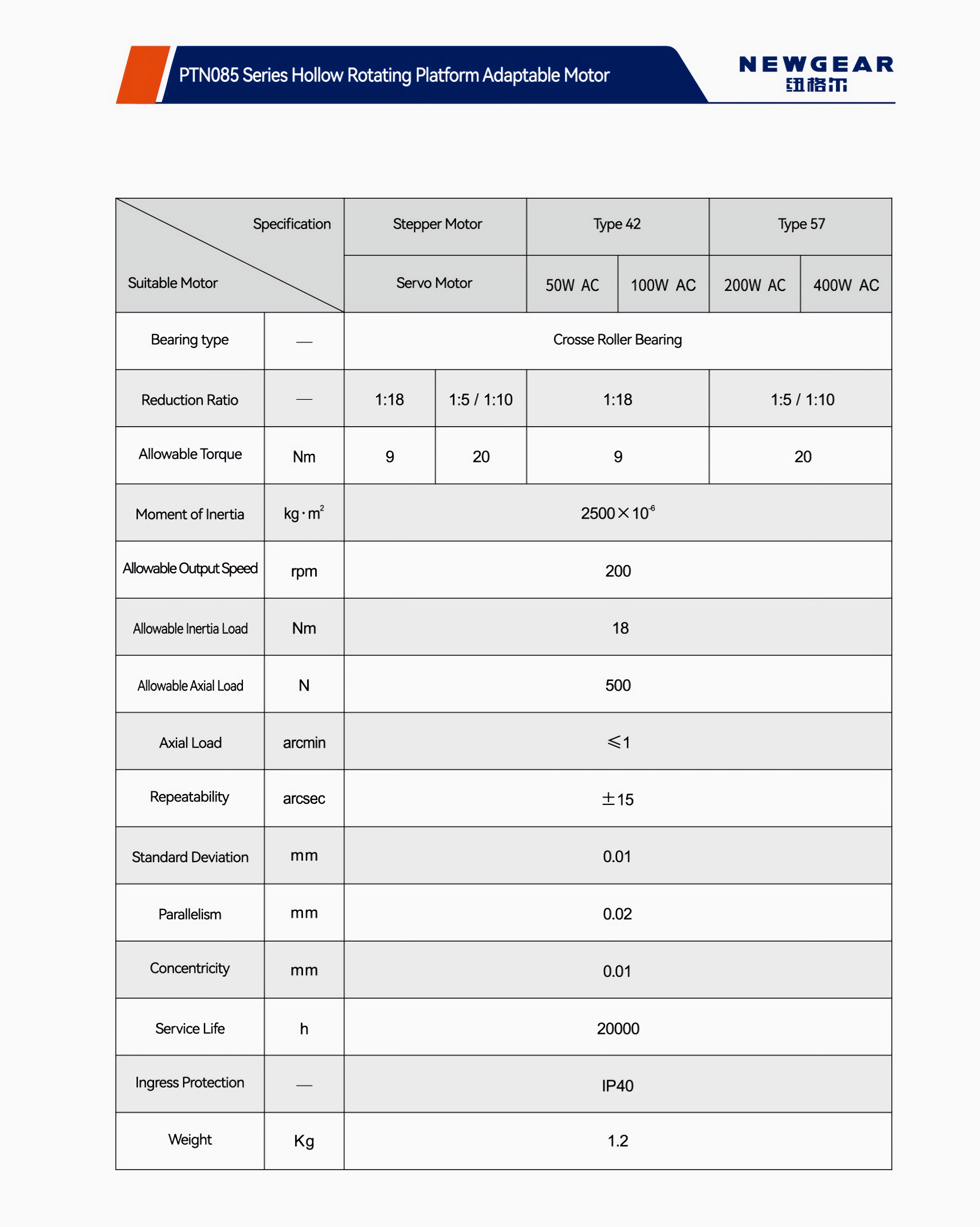 طاولة الدوران المجوفة PTN085 متعددة الاستخدامات، ومتوافقة مع محركات الخطوة NEMA 17 و23 ومحركات السيرفو AC بقدرة 50 إلى 400 واط. توفر نسب تروس 5 و10 و18:1، مع خلوص ≤1 دقيقة قوسية وتكرارية ±15 ثانية قوسية. بفضل هيكلها المتين المزود بمحمل أسطواني متقاطع وتصميمها ذي الثقوب النافذة، تضمن قدرة تحمل عالية وسهولة في تمرير الكابلات. حاصلة على تصنيف IP40، مما يجعلها مناسبة للبيئات الصناعية العامة. علاوة على ذلك، يمكن دمجها بمرونة مع علب التروس الكوكبية PX60/PRF60 لتوسيع خيارات عزم الدوران ونسبة السرعة، مما يوفر حلاً دورانياً قوياً وقابلاً للتكيف لتطبيقات الأتمتة المتنوعة.