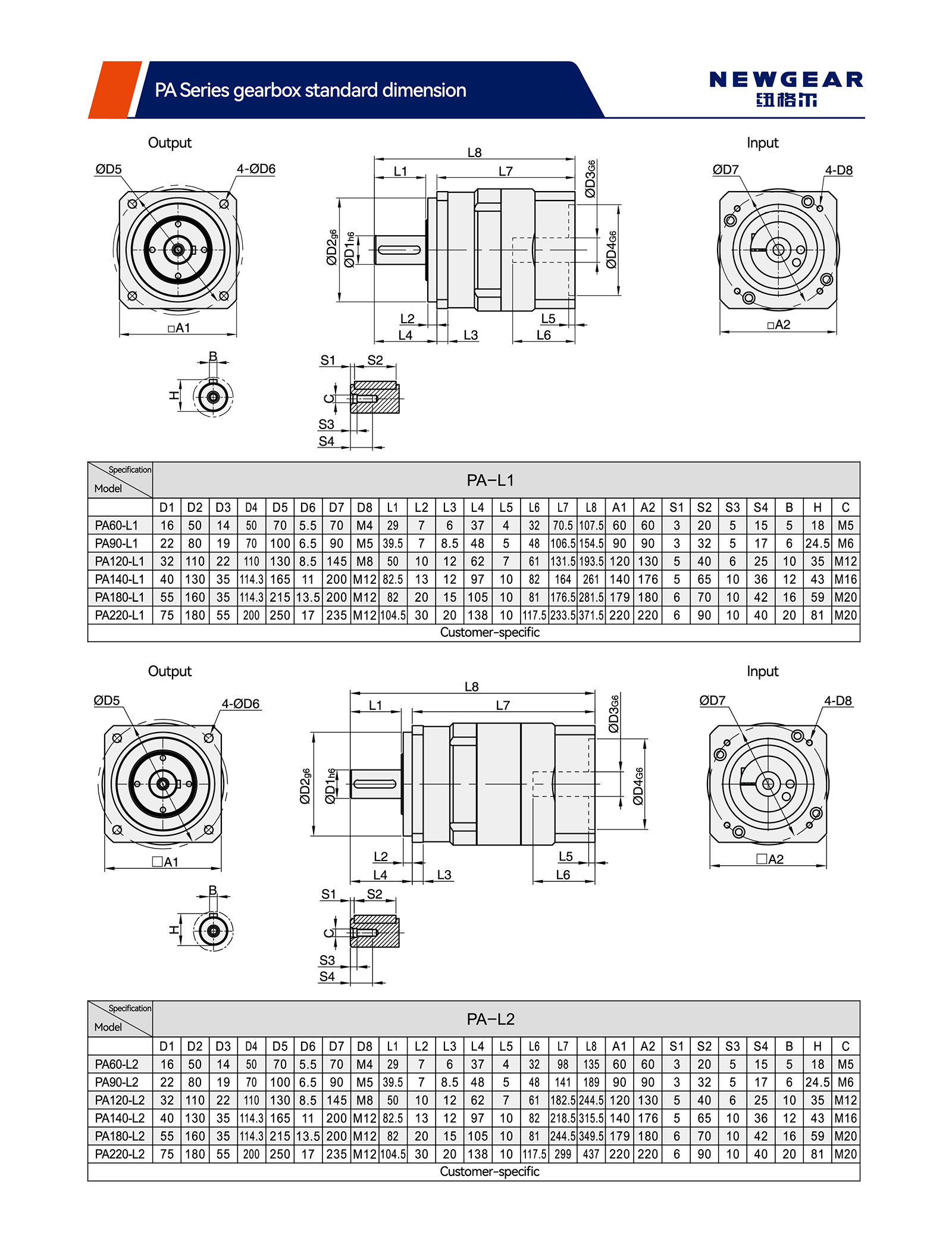 | المعايير الفنية | سلسلة النماذج | PA60 | PA90 | PA120 | PA140 | PA180 | PA220 | ||